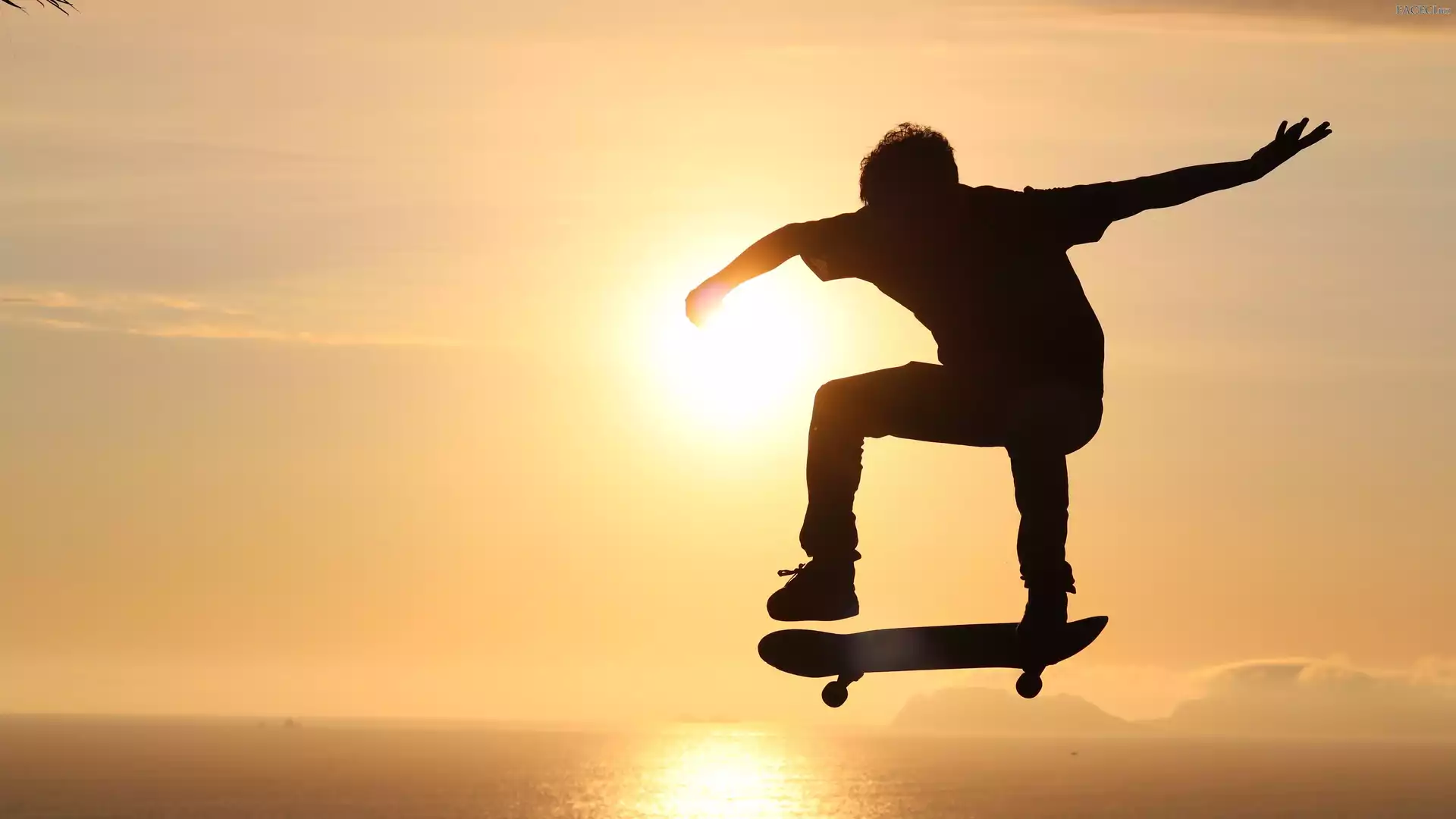 Mężczyzna, Zachód słońca, Deskorolka, Sylwetka